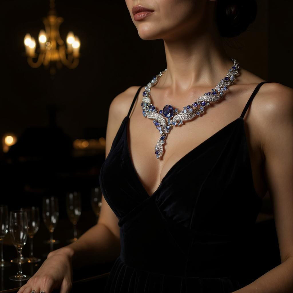 ​Central Focal Point: A large, radiant sapphire-blue centerpiece stone anchors the necklace, drawing the eye and making a powerful statement.