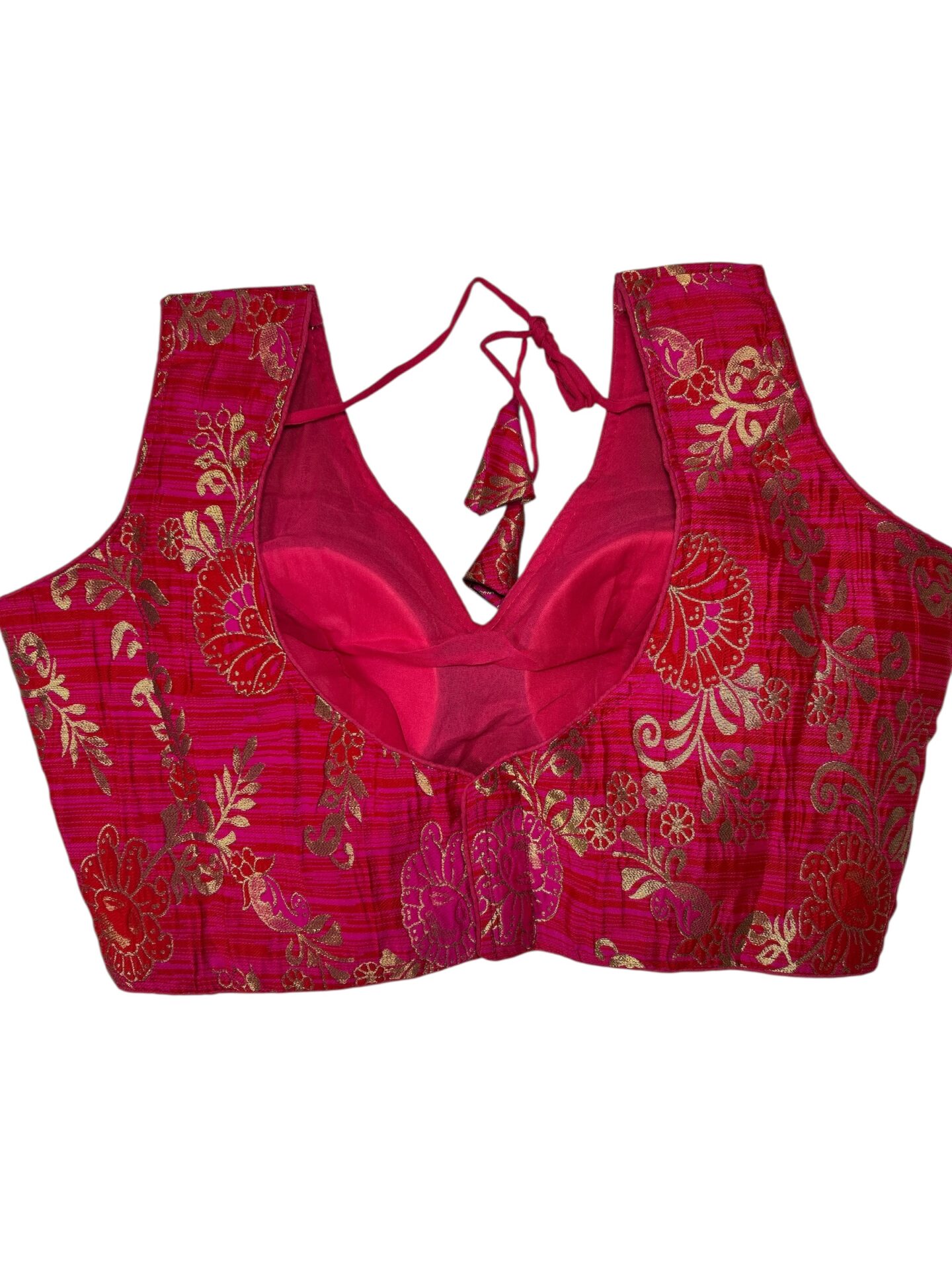 - Blouse: Contrasting deep pink blouse with golden floral motifs.