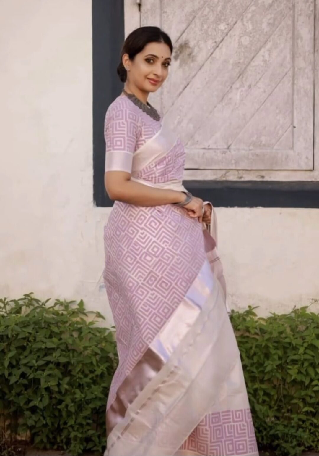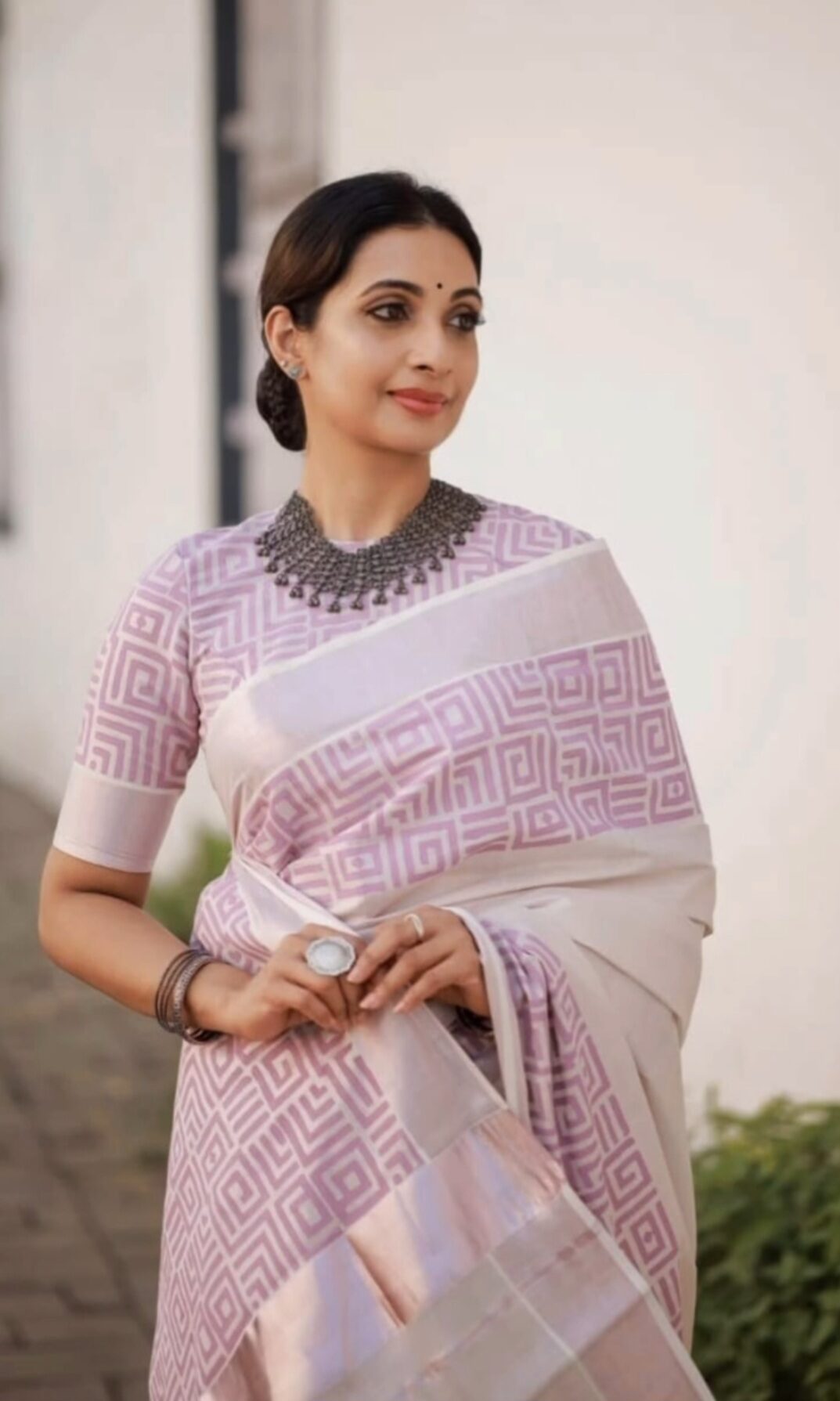 ​Paired with a matching blouse piece featuring the same exquisite geometric pattern, this saree is perfect for weddings, festive occasions, and special events. Its blend of classic and contemporary design ensures you’ll stand out with timeless style.
