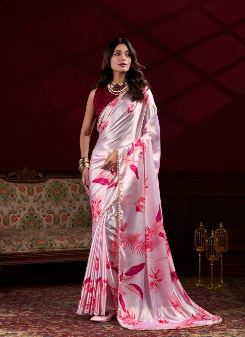 ​This exquisite ensemble features a luxurious satin saree in a soft, pearly pink hue, adorned with a vibrant and artistic digital print of tropical leaves in shades of fuchsia and pink. The saree is designed for modern convenience, with pre-stitched pleats that allow you to drape it in under a minute, giving you a perfect, flawless look every time.