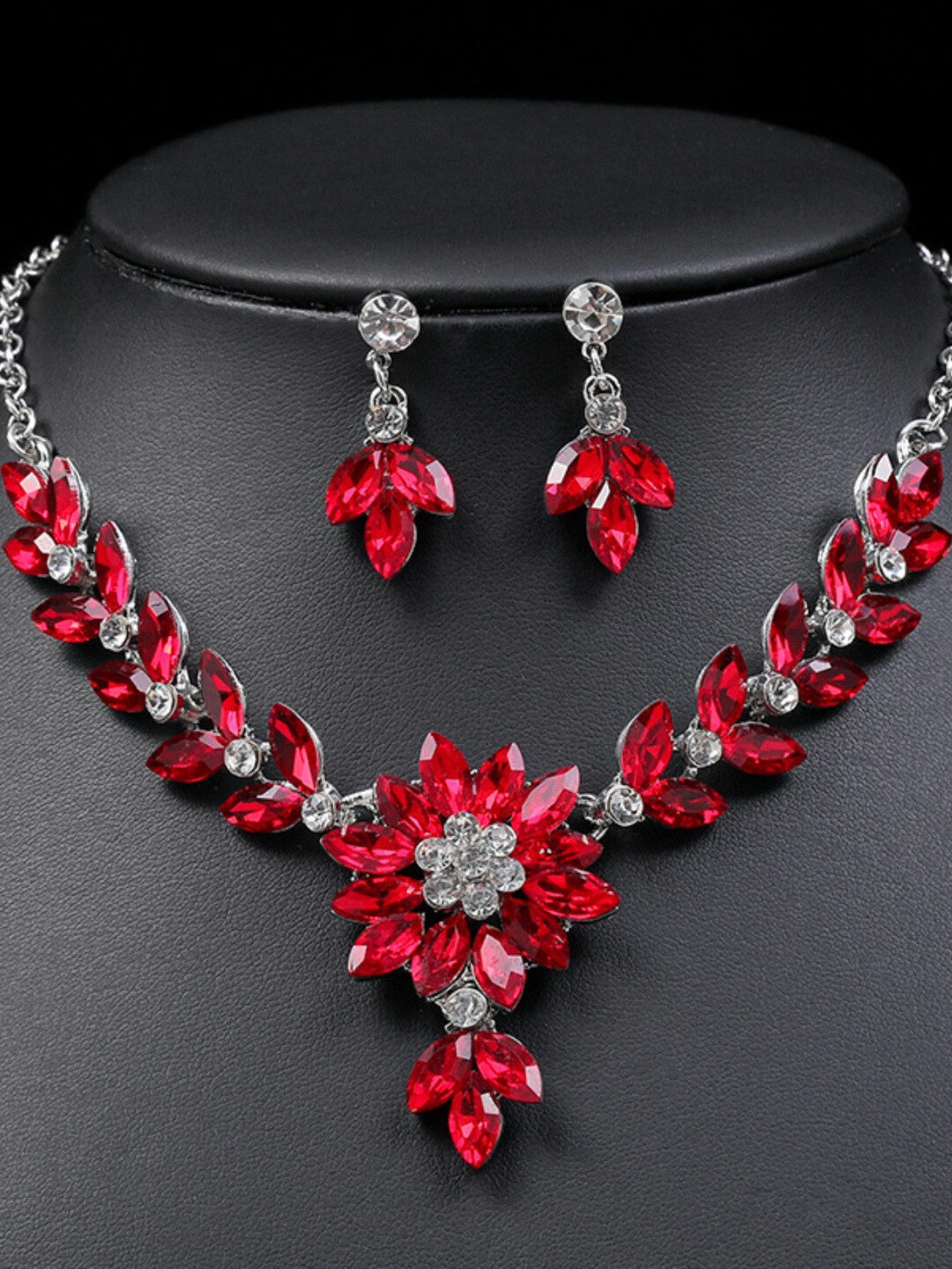 This stunning jewelry set is a perfect choice for a special occasion. The set includes a statement necklace and matching dangle earrings, both featuring a striking floral and leaf design. The pieces are crafted with a silver-toned metal and adorned with brilliant red and clear rhinestones. The red stones are a vibrant ruby or crimson hue, cut in marquise and round shapes to create a delicate and eye-catching floral pattern. The necklace sits elegantly at the collarbone, with a central flower motif and symmetrical leaves branching out. The coordinating earrings mimic the same leaf design, dangling gracefully. This set would be ideal for a formal event, a wedding, or a festive celebration, and would complement a variety of necklines.