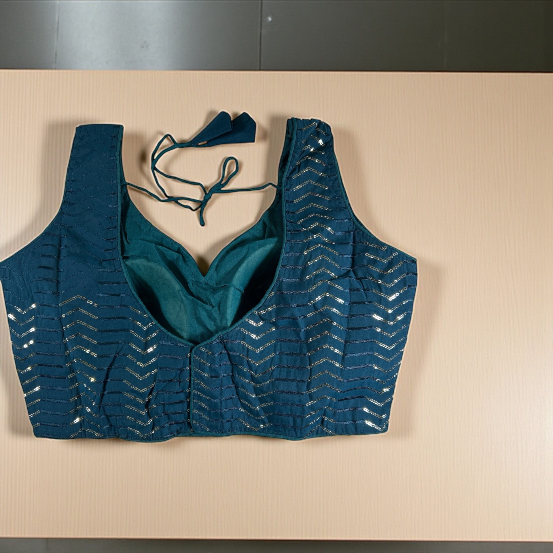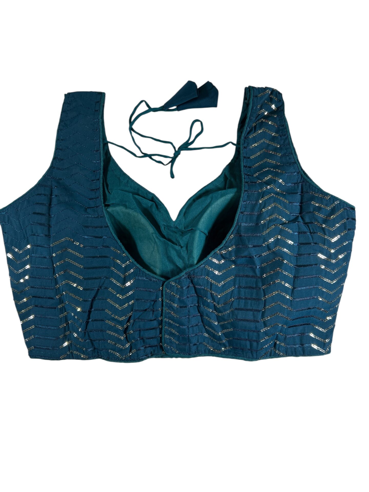 Make a statement with this stunning teal blouse, a perfect blend of classic style and modern sophistication. The blouse is made from a beautiful, deep teal fabric and features a subtle yet captivating chevron pattern created with shimmering gold sequins.
