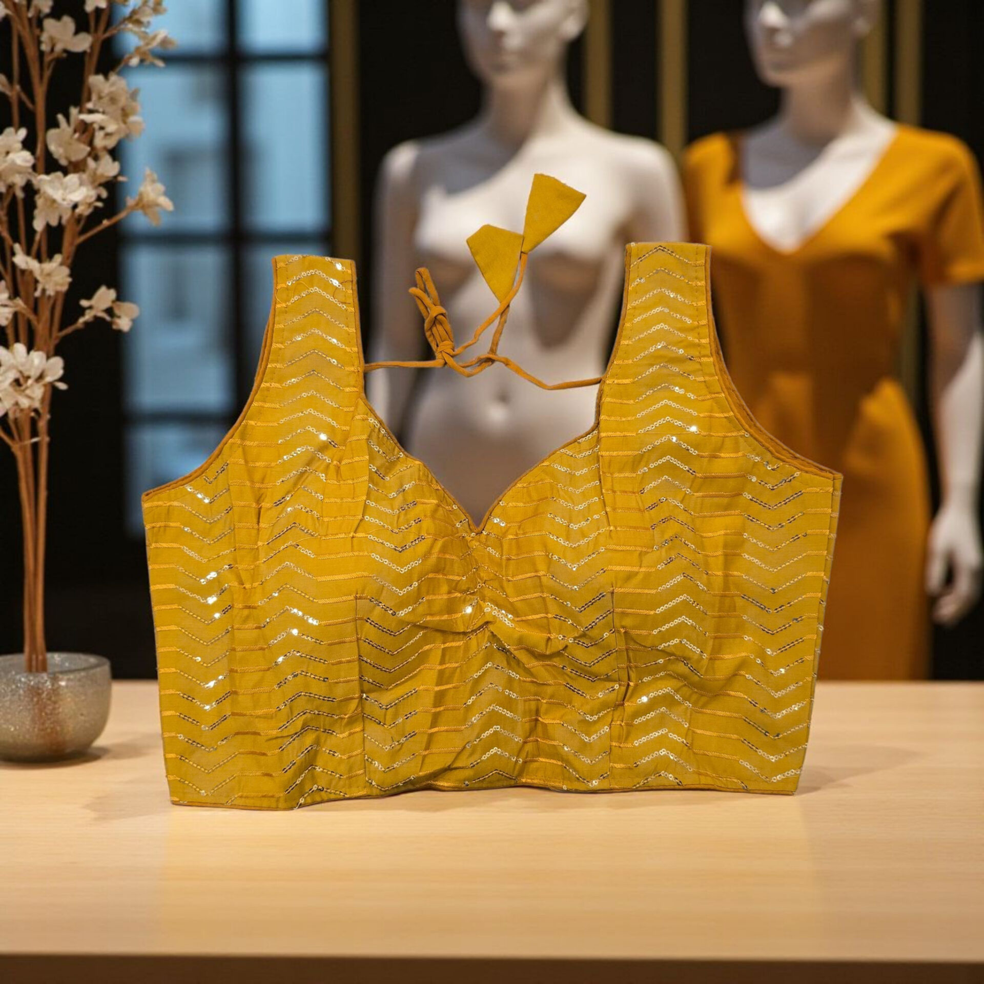 This beautiful, ready-to-wear blouse features intricate thread work in a chevron pattern, adorned with sparkling sequins that catch the light with every movement. The vibrant yellow color makes it a perfect match for a variety of sarees, lehengas, or skirts, adding a touch of traditional elegance to any outfit.