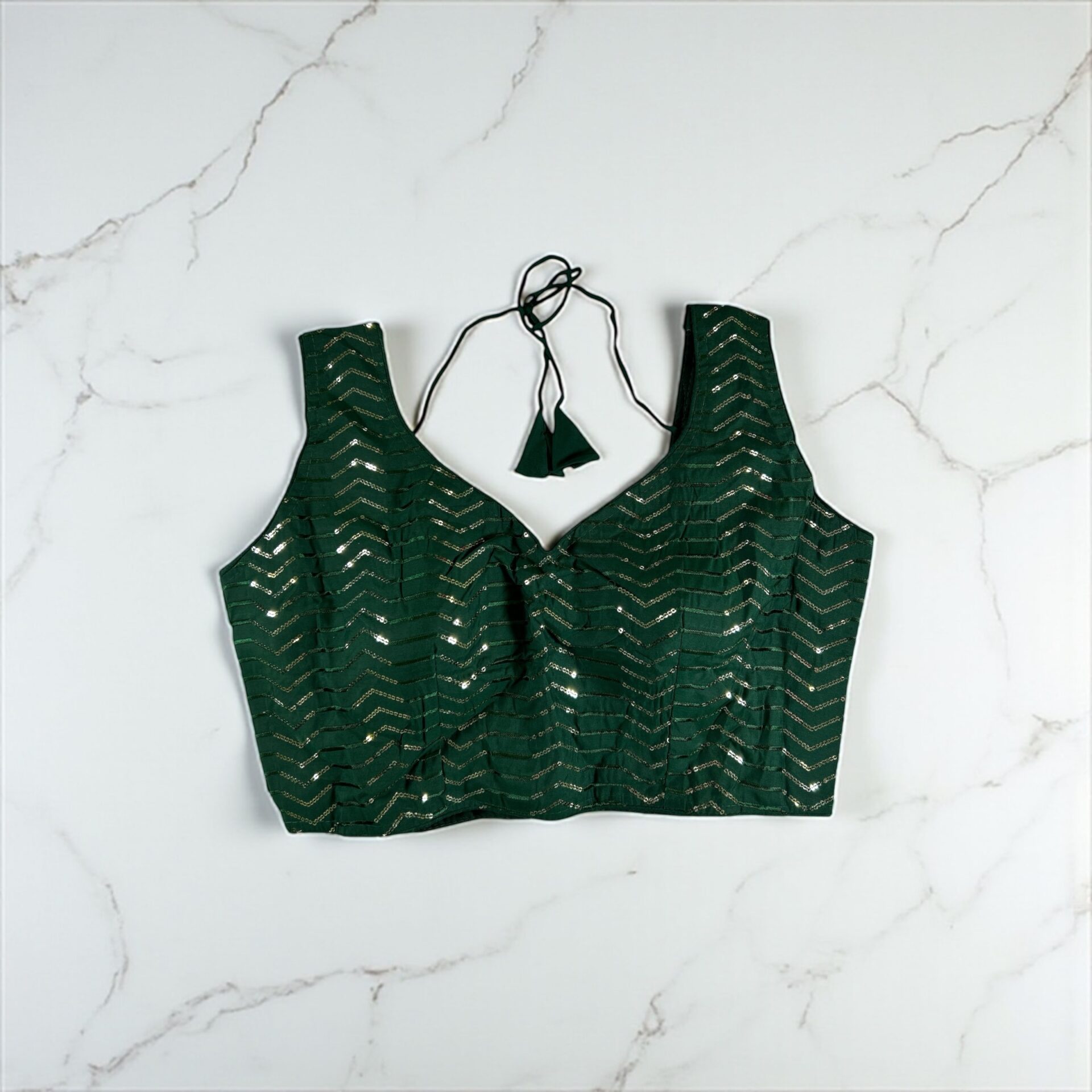 This elegant emerald green blouse is a perfect addition to your ethnic wear collection, offering a beautiful blend of traditional design and modern sparkle. The blouse is made from a rich, dark green fabric, adorned with a captivating chevron pattern of shimmering gold sequins that create a luxurious and eye-catching effect.
